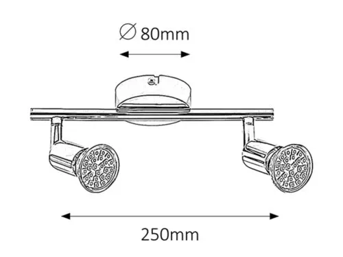 Modern megjelenésű mennyezeti spotlámpa 2 db foglalattal és energiatakarékos LED fényforrással. 25 cm széles, króm színű, fémből készített lámpatest és pozícionálható lámpabúrák. A lámpatestbe helyezett LED fényforrások 2x 3W teljesítmény mellett 2x 250 lumenes fényerőt, valamint 3000 Kelvines, melegfehér színű fényt biztosítanak. Izzócserét követően a mennyezeti lámpa GU10-es foglalatú, max. 2x 50W teljesítményű halogén vagy LED fényforrásokkal is használható.