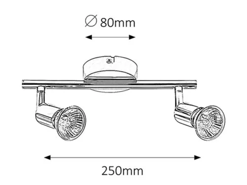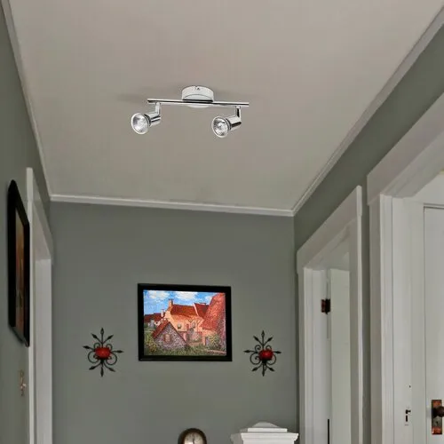 Modern megjelenésű mennyezeti spotlámpa 2 db foglalattal. 25 cm széles, króm színű, fémből készített lámpatest és pozícionálható lámpabúrák. A lámpatest GU10-es foglalatkialakítású, max. 2x 50W teljesítményű energiatakarékos fényforrásokkal is használható.