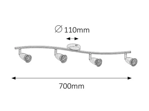Időtlen megjelenésű mennyezeti spotlámpa 4 db foglalattal. 70 cm széles, bronz színű, fémből készített lámpatest és pozícionálható lámpabúrák. A lámpatest GU10-es foglalatkialakítású, max. 4x 50W teljesítményű energiatakarékos fényforrásokkal is használható.