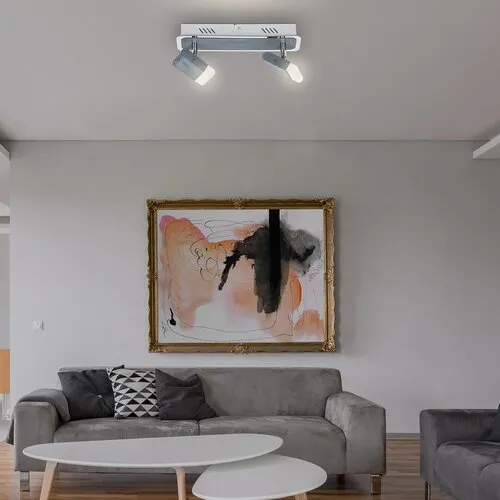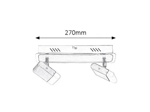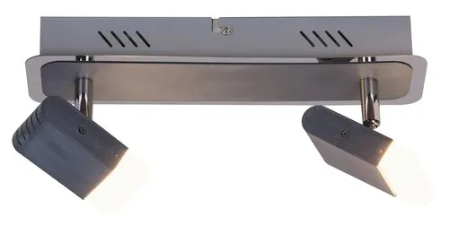 Modern megjelenésű fali és mennyezeti spotlámpa beépített energiatakarékos LED izzókkal. 27 cm széles, szürke és króm színű, fémből és műanyagból készített szerkezet, IP20-as védettséggel. A lámpatestbe beépített, A+ energiaosztályba sorolt, 2x 5W teljesítmény mellett 2x 320 lumen fényerőt és 3000 Kelvines, melegfehér színű fényt biztosító izzók nem cserélhetők.