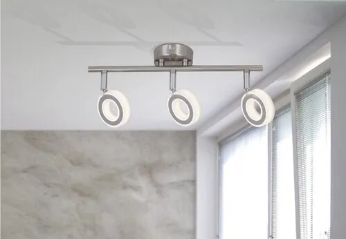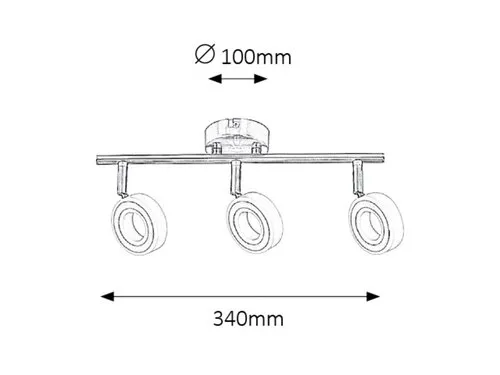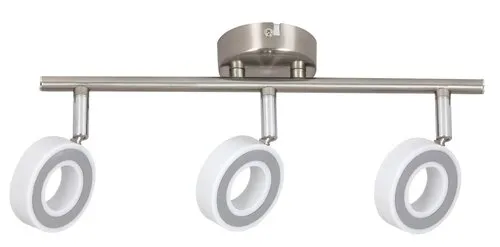 Modern megjelenésű mennyezeti spotlámpa beépített energiatakarékos LED izzókkal. 34 cm széles, króm színű fémből készített lámpatest és pozícionálható, műanyag lámpabúrák IP20-as védettséggel. A beépített LED izzók teljesítménye 3x 4,5W, amelyhez 3x 400 lumen fényerő társul. Színhőmérséklete természetes fehér (4000 Kelvin). A lámpatestben a izzó nem cserélhető. 5 év garanciával!