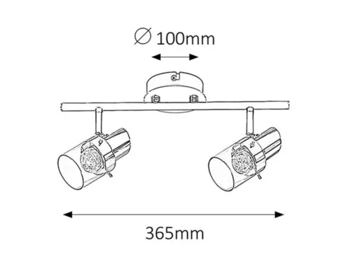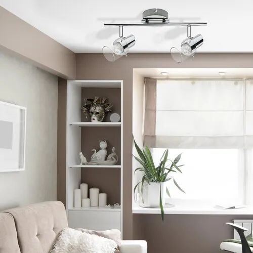 Modern megjelenésű mennyezeti spotlámpa 2 db beépített energiatakarékos LED fényforrással. 36,5 cm széles, króm színű, fémből készített lámpatest pozícionálható, áttetsző üvegkristály díszítésű üveg lámpabúrákkal. A beépített LED fényforrások A+ energiaosztályú besorolás és 2x 4,5W teljesítmény mellett 2x 360 lumenes fényerőt és 3000 Kelvines, azaz melegfehér színű fényt kínálnak. 5 év garanciával. A lámpatestben elhelyezett fényforrások nem cserélhetők.