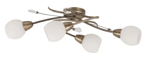 Időtlen stílusú mennyezeti lámpa 4 foglalattal. 64 cm széles, bronz színű fémből készített lámpatest fehér opálüveg lámpabúrákkal, IP20-as védelemmel. A lámpatest E14-es foglalatú, max. 4x 40W teljesítményű halogén vagy energiatakarékos fényforrásokkal használható.