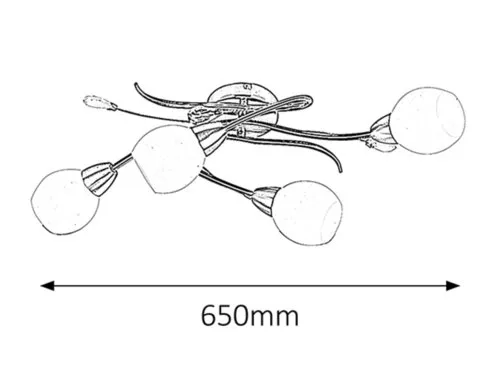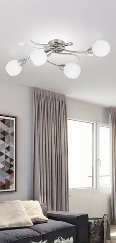 Időtlen stílusú mennyezeti lámpa 4 foglalattal. 65 cm átmérőjű, szatin króm színű fémből készített lámpatest fehér opálüveg lámpabúrákkal, IP20-as védelemmel. A lámpatest E14-es foglalatú, max. 4x 40W teljesítményű halogén vagy energiatakarékos fényforrásokkal használható.