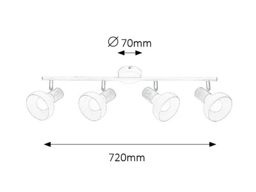 Skandináv stílusú mennyezeti spotlámpa 4 db foglalattal. 72 cm széles, fehér és bükk színkombinációjú fém lámpatest pozícionálható lámpabúrákkal, IP20-as védettséggel. A lámpatest E-14-es foglalatkialakítású, 4x max. 40W teljesítményű, energiatakarékos izzókkal is használható.