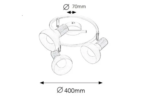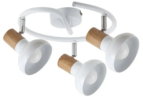 Skandináv stílusú mennyezeti spotlámpa 3 db foglalattal. 40 cm átmérőjű, fehér és bükk színkombinációjú fém lámpatest pozícionálható lámpabúrákkal, IP20-as védettséggel. A lámpatest E-14-es foglalatkialakítású, 3x max. 40W teljesítményű, energiatakarékos izzókkal is használható.