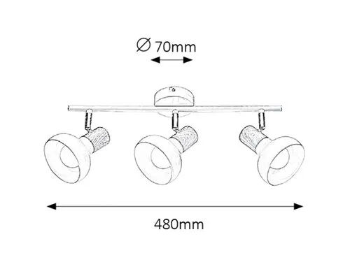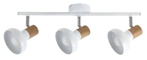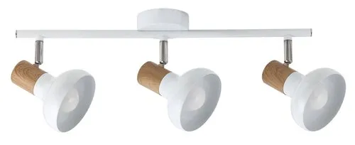 Skandináv stílusú mennyezeti spotlámpa 3 db foglalattal. 48 cm széles, fehér és bükk színkombinációjú fém lámpatest pozícionálható lámpabúrákkal, IP20-as védettséggel. A lámpatest E-14-es foglalatkialakítású, 3x max. 40W teljesítményű, energiatakarékos izzókkal is használható.