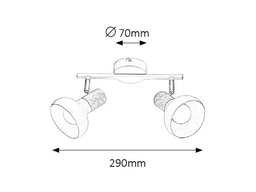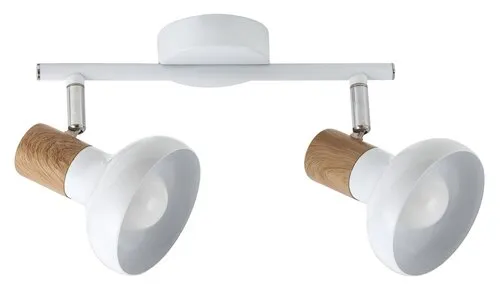 Skandináv stílusú fali vagy mennyezeti spotlámpa 2 db foglalattal. 29 cm széles, fehér és bükk színkombinációjú fém lámpatest pozícionálható lámpabúrákkal, IP20-as védettséggel. A lámpatest E-14-es foglalatkialakítású, 2x max. 40W teljesítményű, energiatakarékos izzókkal is használható.