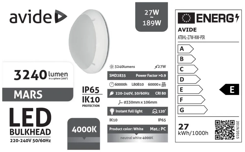 Avide (Mars) Cseppálló Mennyezeti Lámpa Kerek IP65 27W NW 4000K Fehér + PIR