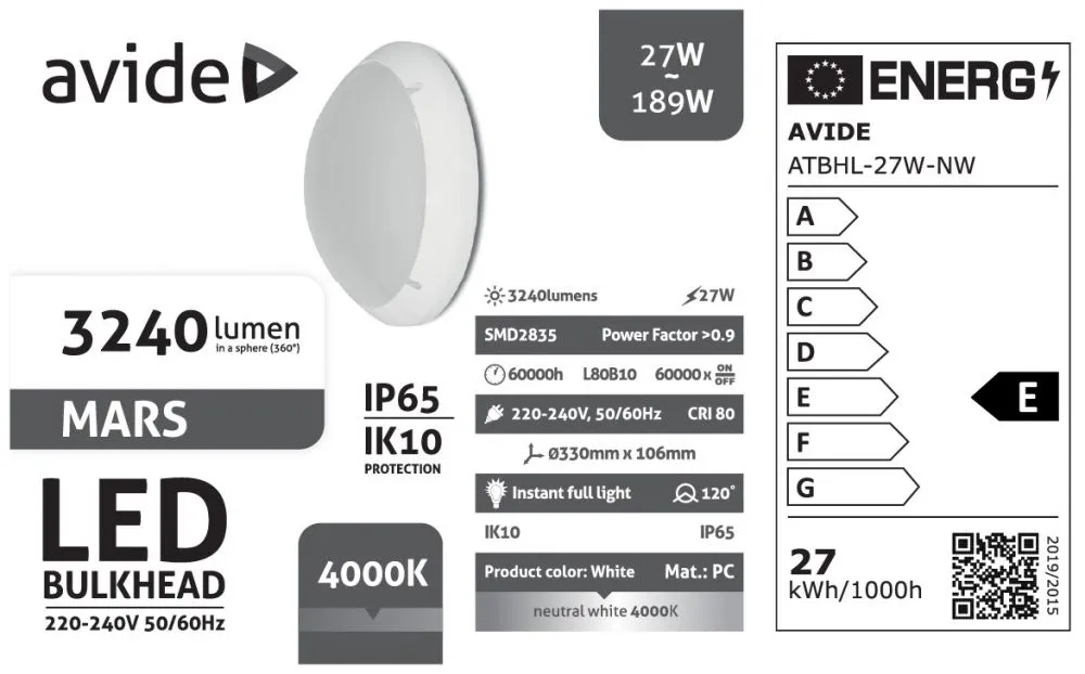 Avide (Mars) Cseppálló Mennyezeti Lámpa Kerek IP65 27W NW 4000K Fehér