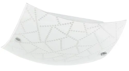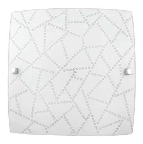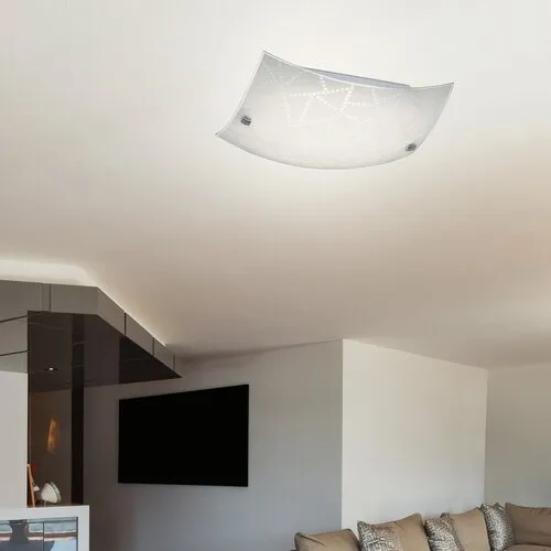 Modern megjelenésű mennyezeti lámpa beépített energiatakarékos LED fényforrással. Fém lámpatest és 29,5 x 29,5 cm széles, fehér alapon mintás üveg lámpabúra króm színű rögzítőcsavarokkal. A beépített LED fényforrás A+ energiaosztály besorolású és 12W teljesítmény mellett 960 lumenes fényerőt, továbbá 3000 Kelvines, melegfehér színű fényt ad. 5 év garanciával. A lámpatestben a fényforrás nem cserélhető.