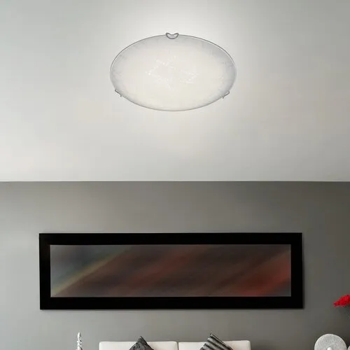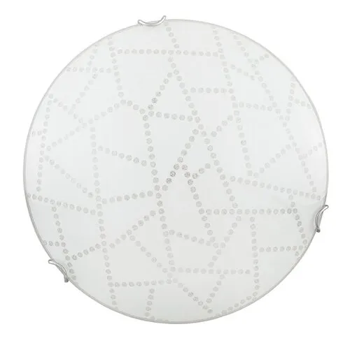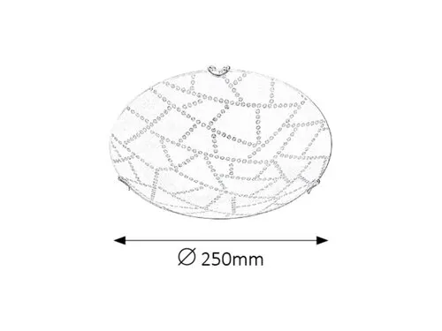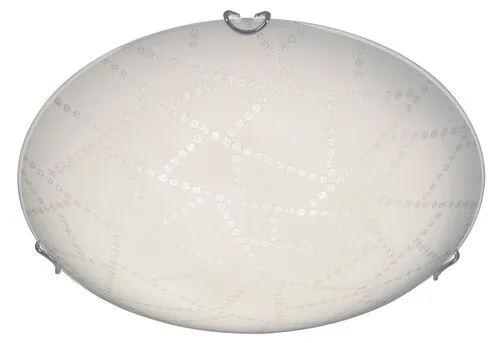 Modern megjelenésű mennyezeti lámpa beépített energiatakarékos LED fényforrással. Fém lámpatest és 25 cm átmérőjű, fehér alapon mintás üveg lámpabúra króm színű rögzítőkörmökkel. A beépített LED fényforrás A+ energiaosztály besorolású és 12W teljesítmény mellett 960 lumenes fényerőt, továbbá 3000 Kelvines, melegfehér színű fényt ad. 5 év garanciával. A lámpatestben a fényforrás nem cserélhető.