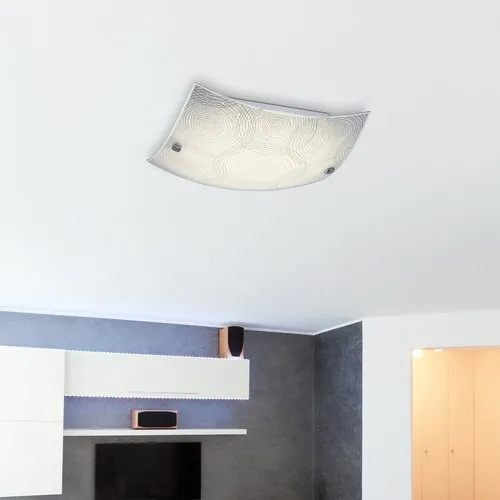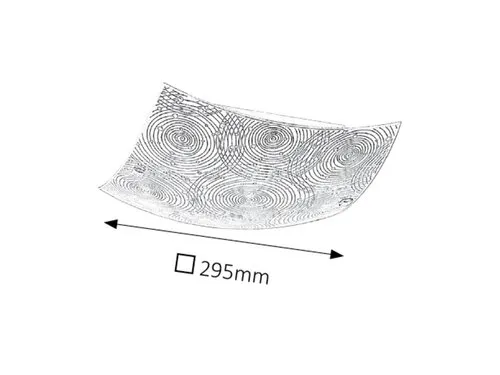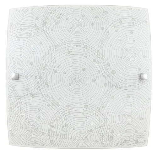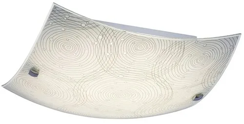 Modern megjelenésű mennyezeti lámpa beépített energiatakarékos LED fényforrással. Fém lámpatest és 29,5 x 29,5 cm széles, fehér alapon mintás üveg lámpabúra króm színű rögzítőcsavarokkal. A beépített LED fényforrás A+ energiaosztály besorolású és 12W teljesítmény mellett 960 lumenes fényerőt, továbbá 4000 Kelvines, természetes fehér színű fényt ad. 5 év garanciával. A lámpatestben a fényforrás nem cserélhető.