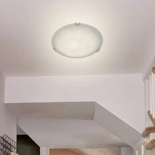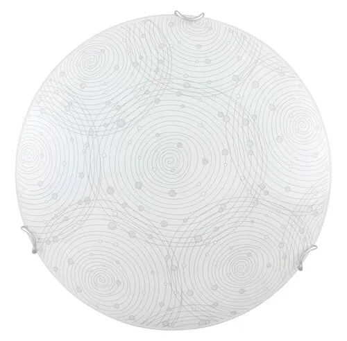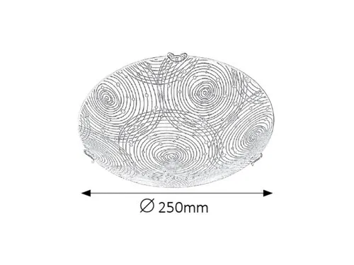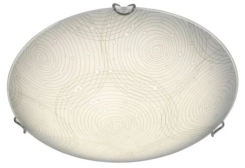 Modern megjelenésű mennyezeti lámpa beépített energiatakarékos LED fényforrással. Fém lámpatest és 25 cm átmérőjű, fehér alapon mintás üveg lámpabúra króm színű rögzítőkörmökkel. A beépített LED fényforrás A+ energiaosztály besorolású és 12W teljesítmény mellett 960 lumenes fényerőt, továbbá 4000 Kelvines, természetes fehér színű fényt ad. 5 év garanciával. A lámpatestben a fényforrás nem cserélhető.