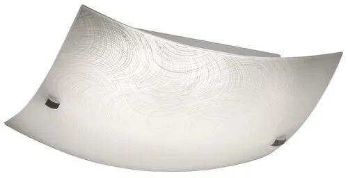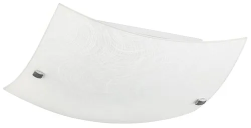 Modern megjelenésű mennyezeti lámpa beépített energiatakarékos LED fényforrással. Fém lámpatest és 29,5 x 29,5 cm széles, fehér alapon mintás üveg lámpabúra króm színű rögzítőcsavarokkal. A beépített LED fényforrás A+ energiaosztály besorolású és 12W teljesítmény mellett 960 lumenes fényerőt, továbbá 4000 Kelvines, természetes fehér színű fényt ad. 5 év garanciával. A lámpatestben a fényforrás nem cserélhető.