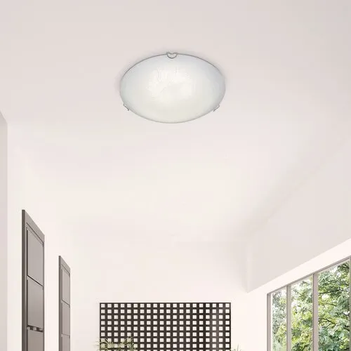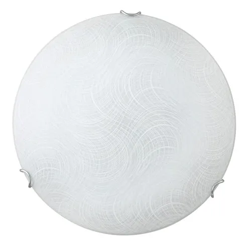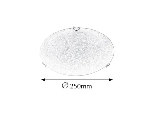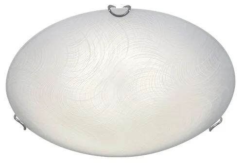 Modern megjelenésű mennyezeti lámpa beépített energiatakarékos LED fényforrással. Fém lámpatest és 25 cm átmérőjű, fehér alapon mintás üveg lámpabúra króm színű rögzítőkörmökkel. A beépített LED fényforrás A+ energiaosztály besorolású és 12W teljesítmény mellett 960 lumenes fényerőt, továbbá 4000 Kelvines, természetes fehér színű fényt ad. 5 év garanciával. A lámpatestben a fényforrás nem cserélhető.