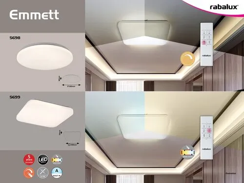 Az Emmett mennyezeti lámpa mindent tud, amit csak egy modern lámpától kívánhatunk: fantasztikus extra funkcióinak köszönhetően tökéletes választás a nappaliba vagy a hálószobába, esetleg egy tágas előszobába. A fémből és műanyagból készült, fehér színű lámpa beépített, energiatakarékos LED fényforrással rendelkezik. A fényforrás teljesítménye 16 W, fényereje 1200 lumen, élettartama 20 000 óra. A lámpa színhőmérséklete tetszés szerint változtatható 3000-6500 K között, ami annyit jelent, hogy képes meleg fehér, természetes fehér vagy éppen hideg fehér fénnyel megvilágítani az adott helyiséget. De itt még nincs vége az extráknak: az Emmett dimmelhető, azaz fényereje igény szerint változtatható. A slim kivitelben készült, kerek mennyezeti lámpa átmérője 340 mm, mennyezettől való távolsága mindössze 60 mm. Az infra távirányítóval szabályozható Emmet lámpára 5 év garanciát vállalunk.