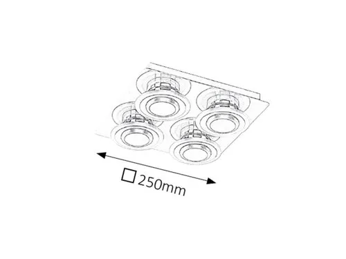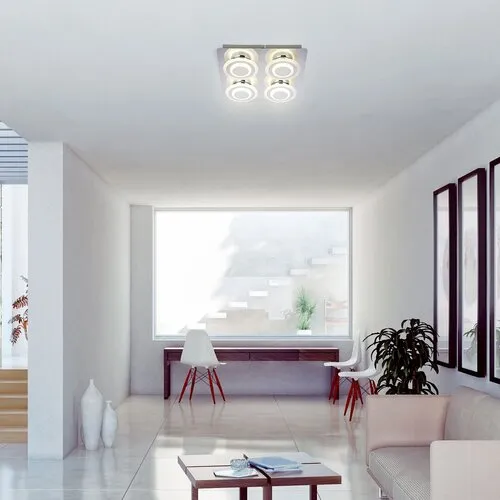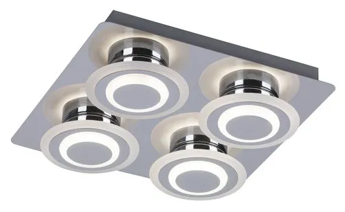 Modern megjelenésű mennyezeti lámpa beépített energiatakarékos LED fényforrásokkal. 25 x 25 cm széles, fém és üveg kombinációjú lámpatest króm színben. A LED fényforrások A+ energiaosztály besorolású és 4x 4W teljesítmény mellett 360 lumenes fényerőt, továbbá 4000 Kelvines, természetes fehér színű fényt biztosítanak. 5 év garanciával. A lámpatestben a fényforrások nem cserélhetők.