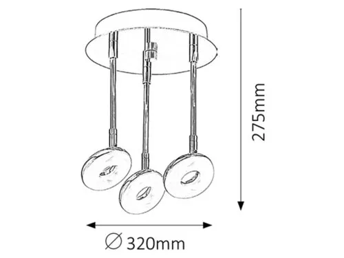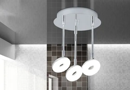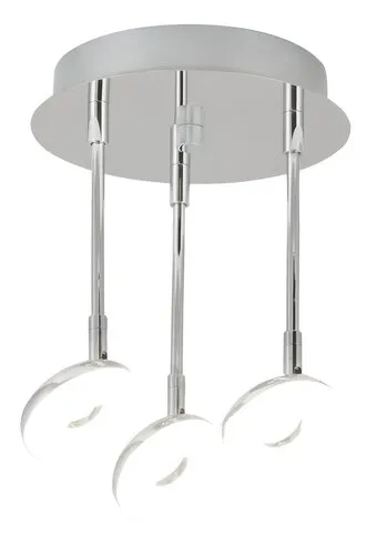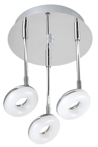 Modern megjelenésű fürdőszobai lámpa beépített, energiatakarékos LED fényforrásokkal. 32 cm átmérőjű, 27,5 cm lelógású, króm színű, fémből készített lámpatest és fehér színű, műanyag lámpabúrák, IP44-es, azaz por és fröccsenő víz elleni védelemmel. A beépített LED fényforrások A+ energiaosztályú besorolás és 3x 5W teljesítmény mellett 3x 510 lumenes fényerőt és 4000 Kelvines, természetes fehér színű fényt kínálnak. 5 év garanciával. A lámpatestbe beépített fényforrások nem cserélhetők.