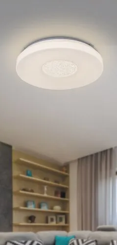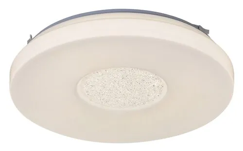 Modern megjelenésű mennyezeti lámpa beépített energiatakarékos LED fényforrással. 36,5 cm átmérőjű, fémből és műanyagból készített szerkezet és lámpabúra fehér színben. A beépített LED fényforrás A energiaosztály besorolású. 18W teljesítmény mellett 1440 lumenes fényerőt, valamint 4000 Kelvines, természetes fehér színű fényt biztosít. 5 év garanciával. A lámpatestben a fényforrás nem cserélhető.