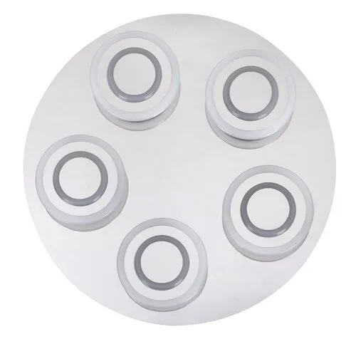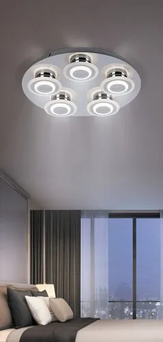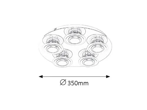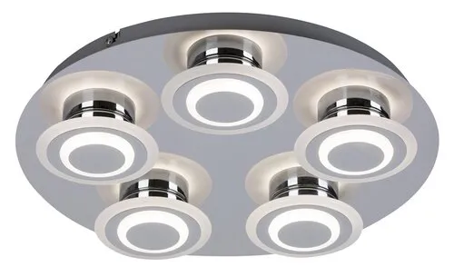 Modern megjelenésű mennyezeti lámpa beépített energiatakarékos LED fényforrásokkal. 35 cm átmérőjű, fém és üveg kombinációjú lámpatest króm színben. A LED fényforrások A+ energiaosztály besorolású és 5x 4W teljesítmény mellett 360 lumenes fényerőt, továbbá 4000 Kelvines, természetes fehér színű fényt biztosítanak. 5 év garanciával. A lámpatestben a fényforrások nem cserélhetők.