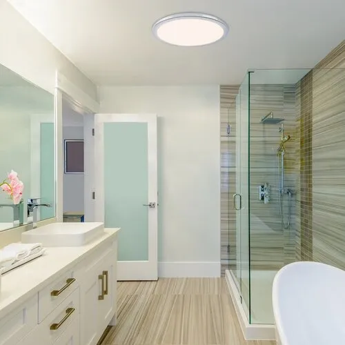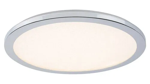 A Jeremy kerek mennyezeti lámpa remek választás lehet bármely modern berendezésű fürdőszobába. A fémből és műanyagból készült, króm és kristály színű lámpát cukrozott búrával látták el, és beépített, energiatakarékos LED fényforrással rendelkezik. A fényforrás teljesítménye 24 W, fényereje 1500 lumen, élettartama pedig 20 000 óra. 3000 K-es színhőmérsékletének megfelelően meleg fehér fénnyel világítja meg környezetét, kellemes, meghitt hangulatot teremtve. A lámpa fali kapcsolóval három lépésben dimmelhető, azaz fényerejét tetszés szerint változtathatjuk. A 400 mm átmérőjű lámpa extra vékony kivitelben készül, mennyezettől való távolsága mindössze 25 mm. IP44-es védettsége garantálja, hogy legfeljebb 1 mm átmérőjű tárgyak behatolása ellen, valamint bármilyen irányból fröccsenő víz ellen védett. A Jeremy fürdőszobai lámpára 5 év garanciát vállalunk.