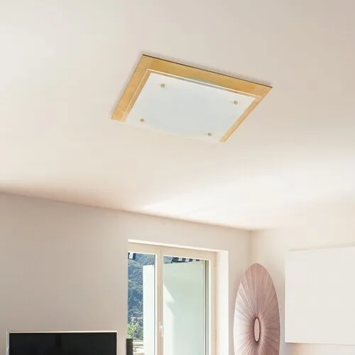 Minimalista stílusú, modern megjelenésű mennyezeti lámpa beépített energiatakarékos LED fényforrással. 42 x 42 cm széles, arany fólia és fehér színkombinációjú fém és üveg szerkezet. A beépített LED fényforrás A+ energiaosztály besorolású és 24W teljesítmény mellett 1920 lumenes fényerőt, valamint 3000 Kelvines, természetes fehér színű fényt biztosít. 5 év garanciával. A lámpatestben a fényforrás nem cserélhető.