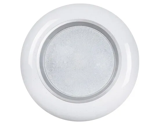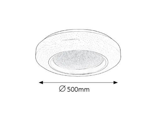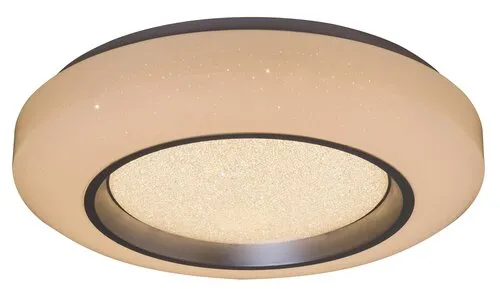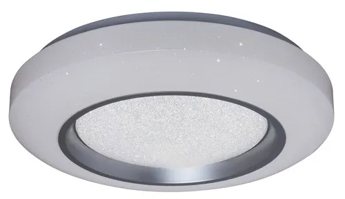 Modern megjelenésű mennyezeti lámpa távirányítóval állítható fényerejű és színhőmérsékletű, beépített energiatakarékos LED izzóval. Fehér és ezüst színű, fémből és alumíniumból készített szerkezet 50 cm átmérővel, csillogó hatást keltő, műanyag lámpabúrával. IP20-as védettségű. A távirányítóval vezérelhető LED izzó teljesítménye 38W, amelyhez 2780 lumen , állítható fényerő társul. Színhőmérséklete meleg, természetes és hidegfehér között változtatható (3000 és 6000 Kelvin). A lámpatestben a izzó nem cserélhető. 5 év garanciával!