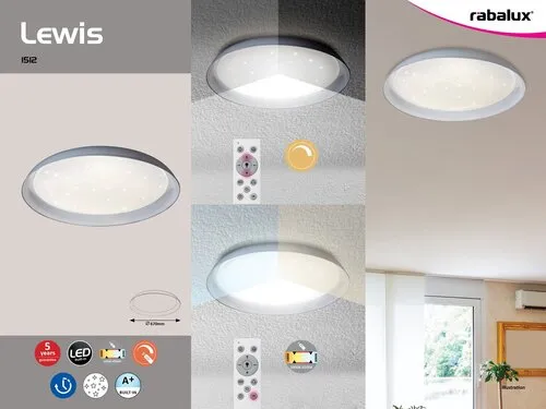 A csillogó effekttel készült Lewis mennyezeti lámpa diszkrét, ugyanakkor sokoldalú kiegészítője lehet modern berendezésű nappalinknak, hálószobánknak vagy előszobánknak. Ez a fehér színben készült okos lámpa sokkal többet nyújt egy szokványos modellnél: dimmelhető, azaz fényereje igény szerint változtatható, valamint beépített fényforrásának színhőmérséklete tetszés szerint állítható 3000-6500 K között. Ez azt jelenti, hogy képes meleg fehér, természetes fehér vagy éppen hideg fehér fénnyel megvilágítani az adott helyiséget, így alkalmazkodva igényeinkhez ill. akár pillanatnyi hangulatunkhoz. A fémből és műanyagból készült lámpa szabályozását távirányító teszi még kényelmesebbé. A beépített, energiatakarékos (A+ energiaosztályba tartozó) LED fényforrás teljesítménye 40 W, fényereje 3600 lumen, élettartama pedig mintegy 30 000 óra. A 670 mm átmérőjű, kerek lámpa mennyezettől való távolsága 95 mm. Erre a modellre 5 év garanciát vállalunk.