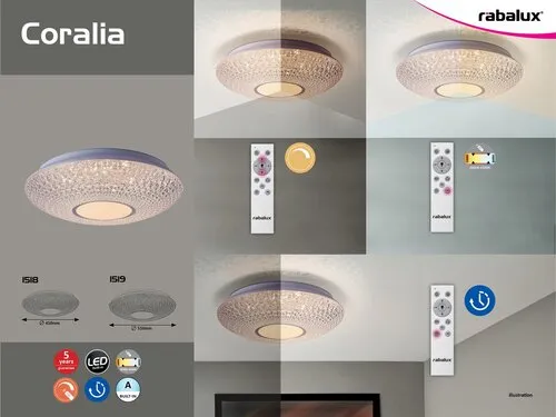 Aki kedveli az elegáns, szemet gyönyörködtető megoldásokat, annak bátran ajánljuk a Coralia mennyezeti lámpát modern nappalijába vagy hálószobájába. Ez az átlátszó, fehér és króm színkombinációban készült modell nem csupán megjelenésében nyújt többet egy átlagos lámpánál: számos extra funkciójának köszönhetően képes alkalmazkodni igényeinkhez, vagy akár pillanatnyi hangulatunkhoz. A fémből és műanyagból készült okos lámpa dimmelhető, azaz fényereje igény szerint változtatható. A beépített, energiatakarékos LED fényforrás teljesítménye 48 W, fényereje 3476 lumen, élettartama 25 000 óra. A fényforrás színhőmérséklete tetszés szerint állítható 3000-6500 K között, azaz képes meleg fehér, természetes fehér vagy éppen hideg fehér fénnyel megvilágítani az adott helyiséget. A lámpa használatát időzítő funkció és távirányító teszi igazán kényelmessé. A 410 mm átmérőjű, kerek mennyezeti lámpára 5 év garanciát vállalunk.