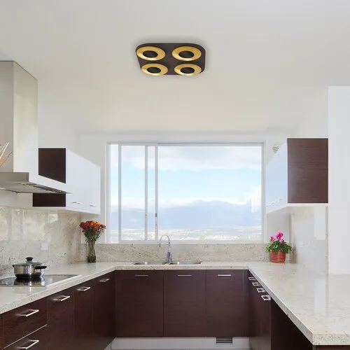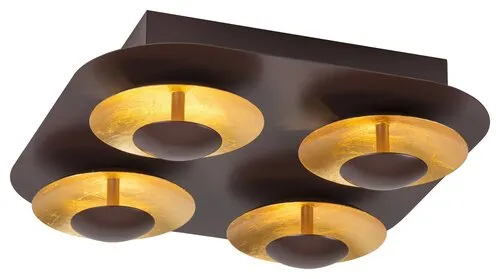 Modern megjelenésű, indirekt megvilágítást nyújtó mennyezeti lámpa beépített energiatakarékos LED fényforrásokkal. 30 x 30 cm széles, barna és arany színkombinációjú, fémből készített szerkezet IP20-as védettséggel. A beépített LED fényforrások A+ energiaosztály besorolásúak. 4x 5W teljesítmény mellett 400 lumenes fényerőt, továbbá 3000 Kelvines, melegfehér színű fényt adnak. 5 év garanciával. A lámpatestben a fényforrások nem cserélhetők.