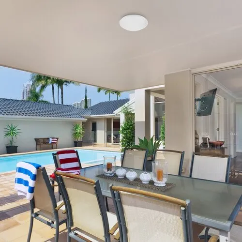 A funkcionális stílusban készült Lucas mennyezeti lámpa univerzális darabja lehet modern otthonunk berendezésének. A kerek lámpát a lakás szinte bármely helyiségében elhelyezhetjük, a nappalitól az előszobán át a fürdőszobáig. IP44-es védettsége garantálja, hogy legfeljebb 1 mm átmérőjű tárgyak behatolása ellen, valamint bármilyen irányból fröccsenő víz ellen védett. A Lucas ráadásul mozgásérzékelővel is rendelkezik, a szenzor 5-8 méter távolságból, 120°-os látószögben érzékeli a mozgást, és 40 mp-re működésbe hozza a lámpát. A fémből és műanyagból készült, fehér színű Lucas beépített LED fényforrással rendelkezik, amelynek teljesítménye 12 W, fényereje 780 lumen, élettartama pedig mintegy 30 000 óra. 4000 K-es színhőmérsékletének megfelelően természetes fehér fénnyel világítja meg környezetét, tiszta, modern hatást keltve. A 260 mm átmérőjű lámpa mennyezettől való távolsága 90 mm. Erre a modellre 5 év garanciát vállalunk.