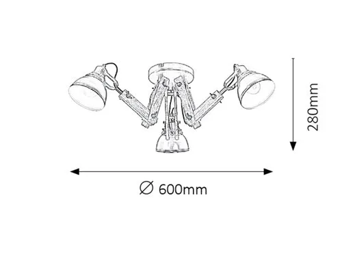 Indusztriális stílusú mennyezeti lámpa 3 db foglalattal. 28 cm lelógású, 60 cm átmérőjű, fekete színű fémből és bükk színű fából készített szerkezet. Pozícionálható lámpabúrákkal, vezetékes kapcsolóval és IP20-as védettséggel rendelkezik. A lámpatest E14-es foglalatkialakítású, 3x max. 15W teljesítményű, kizárólag energiatakarékos izzókkal használható.