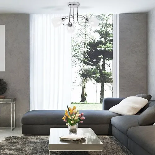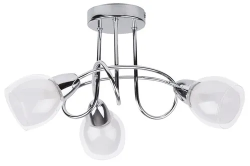 Modern megjelenésű mennyezeti lámpa 3 db foglalattal. 41 cm átmérőjű, króm színű fém lámpatest és fehér és áttetsző színkombinációjú üveg lámpabúrák. A lámpatest E-14-es foglalatú, max. 3x 40W teljesítményű energiatakarékos fényforrásokkal is használható.