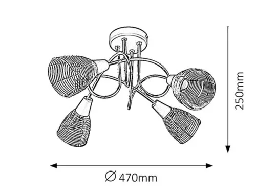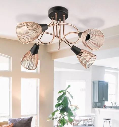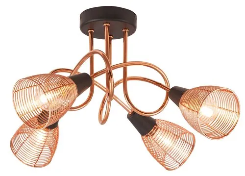 Modern megjelenésű mennyezeti lámpa 4 db foglalattal. 47 cm átmérőjű, fekete és réz színkombinációjú, fémből készített lámpatest és lámpabúrák. A lámpatest E14-es foglalatkialakítású, max. 4x 40W teljesítményű, energiatakarékos LED fényforrásokkal is használható.