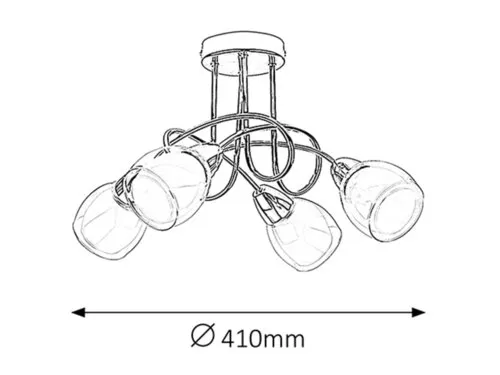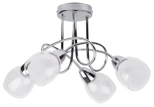 Modern megjelenésű mennyezeti lámpa 4 db foglalattal. 41 cm átmérőjű, króm színű fém lámpatest, fehér és áttetsző színkombinációjú üveg lámpabúrák. A lámpatest E-14-es foglalatú, max. 4x 40W teljesítményű energiatakarékos fényforrásokkal is használható.
