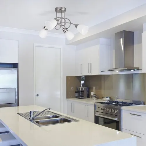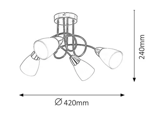 Modern megjelenésű mennyezeti lámpa 4 db foglalattal. 42 cm átmérőjű, 24 cm lenyúlású, szatin króm színű, fémből készített lámpatest és üveg lámpabúrák. A lámpatest E-14-es foglalatú, max. 4x 40W teljesítményű energiatakarékos fényforrásokkal is használható.