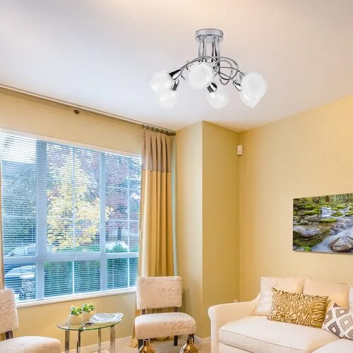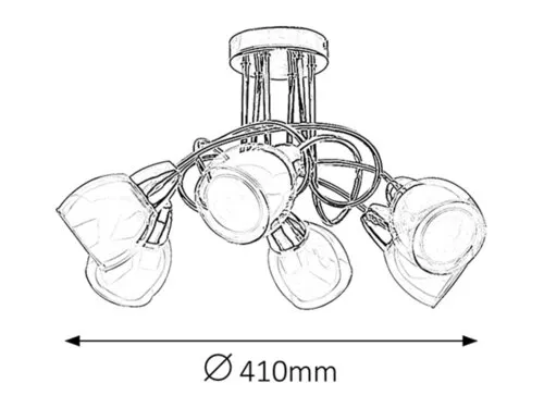Modern megjelenésű mennyezeti lámpa 6 db foglalattal. 41 cm átmérőjű, króm színű fém lámpatest valamint fehér és áttetsző színkombinációjú üveg lámpabúrák. A lámpatest E-14-es foglalatú, max. 6x 40W teljesítményű energiatakarékos fényforrásokkal is használható.