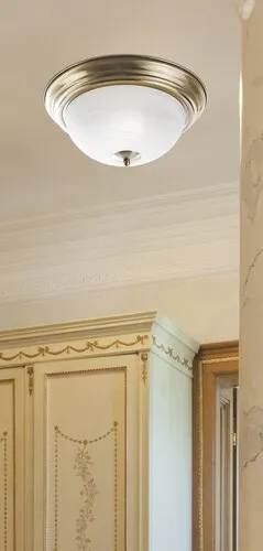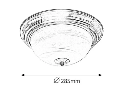 28,5 cm átmérőjű, klasszikus megjelenésű mennyezeti lámpa, fém és műanyag szerkezettel, fehér opálüveg lámpabúrával és bronz színű karimával. 2 db E27-es foglalatban maximum 2x 60W teljesítményű, halogén vagy LED fényforrásokkal is használható.