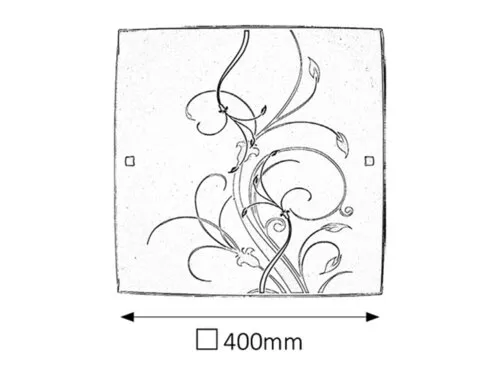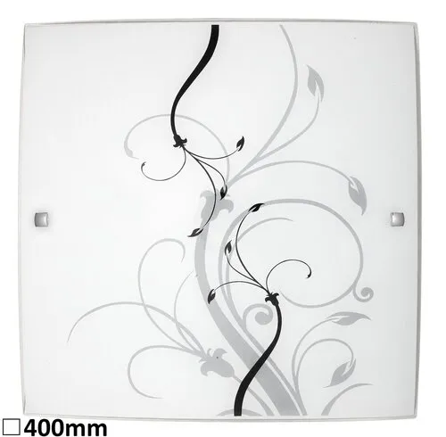 40 x 40 cm-es, modern stílusú mennyezeti lámpa. Fém szerkezet fehér domború opálüvegen fekete-fehér mintával, 2 darab E27-es foglalattal. A lámpatest maximum 2x60W teljesítményű, halogén vagy LED fényforrásokkal is használható.