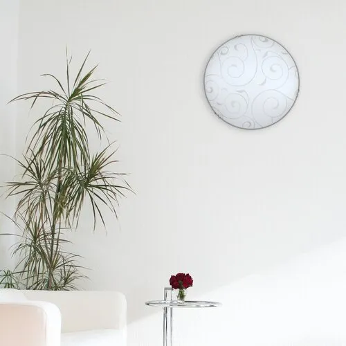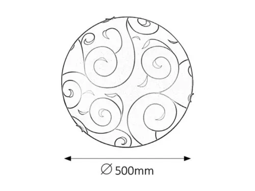 50 cm átmérőjű, modern, mégis időtlen megjelenésű mennyezeti lámpa 3 db E27-es foglalattal, fém és műanyag szerkezettel, mintás, fehér, íves kialakítású opálüveg lámpabúrával, króm színű rögzítőkörmökkel. A lámpatest maximum 3x 40W teljesítményű, halogén vagy LED fényforrásokkal is használható. Kialakításának köszönhetően a fényforrások cseréje, illetve a lámpatest tisztítása gyorsan és egyszerűen elvégezhető.