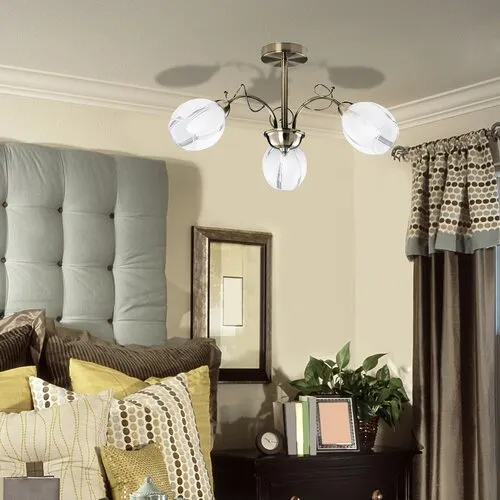 Klasszikus megjelenésű mennyezeti lámpa 3 db foglalattal. 35 cm lenyúlású, 68 cm átmérőjű, bronz színű fém test üveg lámpabúrákkal. A lámpatest E27-es fogalatkialakítású, max. 3x 60W teljesítményű fényforrásokkal használható.