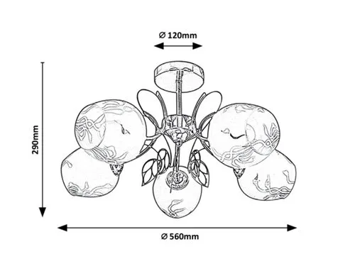 A klasszikus stílusban készült Fauna ötös mennyezeti lámpa hagyományos berendezésű nappalink vagy hálószobánk elegáns kiegészítője lehet. Az aranyszínű, fém lámpatesthez mintás, fehér üvegbúrák kapcsolódnak, a lámpa kerek dísztalp segítségével rögzíthető a mennyezetre. A gömbölyded, alul nyitott búrák a lámpa indaszerűen kanyargó ágaihoz csatlakoznak, amelyeken még néhány aranyszínű levél is helyet kapott. A Fauna öt darab, egyenként legfeljebb 40 W teljesítményű fényforrással használható, a foglalatok típusa E27. Ha a meghitt, otthonos hangulatot szeretnénk erősíteni, válasszunk a lámpához meleg fehér fényű fényforrásokat. A Fauna ötös mennyezeti lámpa méretei a következők: átmérője 560 mm, mennyezettől mért távolsága 290 mm, beépítési átmérője 120 mm. Ezt a modellt fényforrások nélkül szállítjuk.