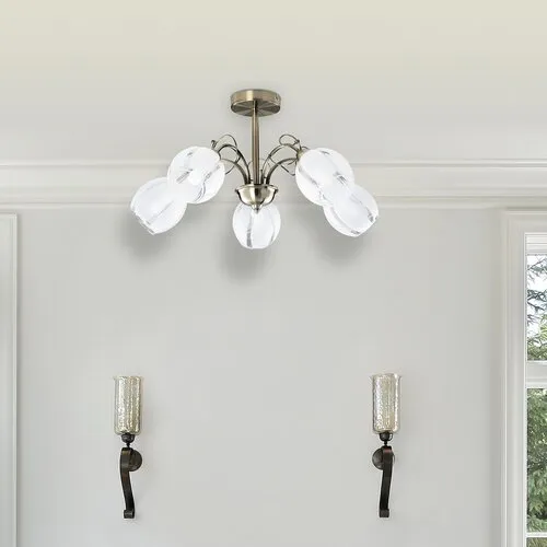 Klasszikus megjelenésű mennyezeti lámpa 5 db foglalattal. 35 cm lenyúlású, 66 cm átmérőjű, bronz színű fém test üveg lámpabúrákkal. A lámpatest E27-es fogalatkialakítású, max. 5x 60W teljesítményű fényforrásokkal használható.