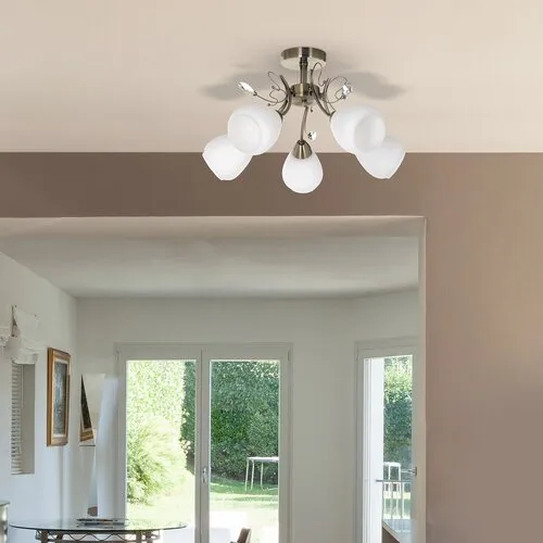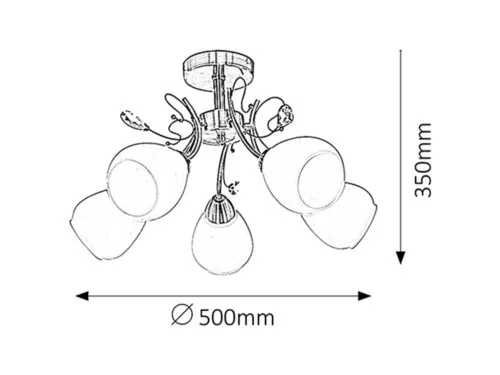 Klasszikus megjelenésű mennyezeti lámpa 5 db foglalattal. 35 cm lenyúlású, 50 cm átmérőjű, bronz színű fém lámpatest üvegkristály díszítéssel, opálüveg lámpabúrákkal. A lámpatest E27-es fogalatkialakítású, max. 5x 60W teljesítményű fényforrássokkal használható.