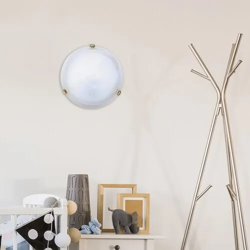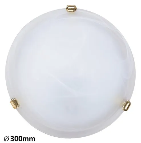 30 cm átmérőjű, klasszikus stílusú mennyezeti lámpa. Fém és műanyag szerkezet kiváló minőségű, vastag, fehér alabástromüveg lámpabúrával, arany színű rögzítő körmökkel. E27-es foglalatú, maximum 60W teljesítményű, halogén vagy LED fényforrással is használható.