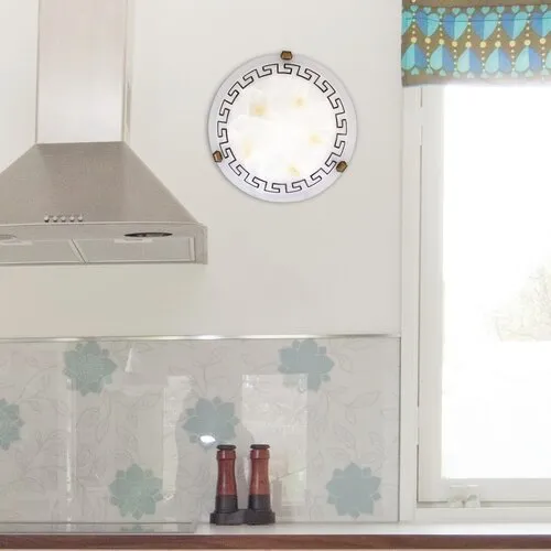 Mediterrán, mégis időtlen stílusú mennyezeti lámpa festett búrával. Fém lámpatest 1 darab E27-es foglalattal, festett, görög mintás opálüvegbúrával, bronz színű rögzítőkörmökkel, 30 cm-es átmérővel. A lámpatest E27-es foglalatú, max. 60W teljesítményű halogén, vagy LED fényforrással is használható. Kialakításának köszönhetően a fényforrás cseréje és a lámpatest tisztítása könnyen elvégezhető.