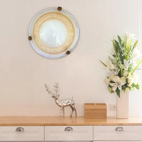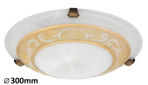 30 cm átmérőjű, mediterrán stílusú mennyezeti lámpa. Fém szerkezet vastag, mintás alabástromüveg lámpabúrával és bronz színű körmökkel. E27-es foglalatú, maximum 60W teljesítményű, halogén vagy LED fényforrással is használható.
