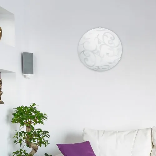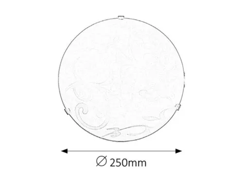 25 cm átmérőjű, időtlen megjelenésű mennyezeti lámpa. Fém és műanyag szerkezetű, mintás opálüveg lámpabúrával. E27-es foglalatú, maximum 60W teljesítményű, halogén vagy LED fényforrással is használható.