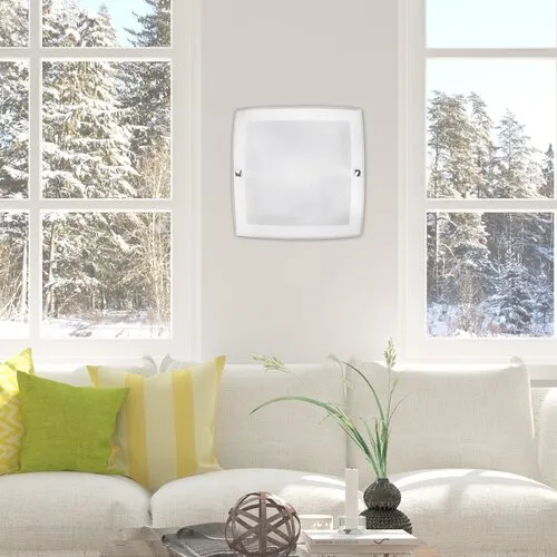 29,5 x 29,5 cm-es, modern stílusú mennyezeti lámpa, fém és műanyag szerkezettel, íves kialakítású fehér üvegbúrával, króm színű díszcsavarokkal. E27-es foglalatú, maximum 60W teljesítményű, halogén vagy LED fényforrással is használható. Kialakításának köszönhetően a fényforrás cseréje, illetve a lámpatest tisztítása gyorsan és egyszerűen elvégezhető.